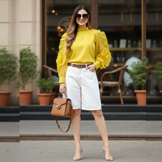 Become a showstopper with this cream coloures ruffled top. Comes up with the trim cut...