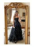 Make your mark this season as you wear this classic black outfit. It has an off-shoulder neckline and a zippered back for support. The top has a cinched look while the skirt is dolled up with ruffle accents. Running to the floor-length hemline, this organza dress is a perfect red-carpet choice.