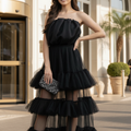 Layered Ruffle Off Shoulder Long Party Dress - Black