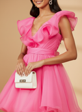 Look like a barbie in this ruffle short dress. It has a sleeveless design with a plunging neckline and ruffled borders. The waistline is cinched with pleat accents while the skater skirt displays ruffle curves at the hemline. This short dress has a perfect fit and is a great choice for cocktails.