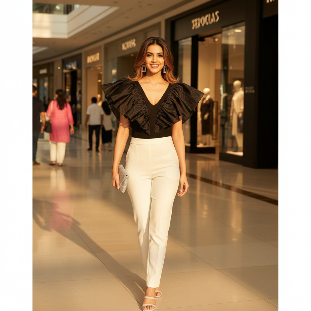 Fashion does not have to be boring, step out in style with this v- neck organza top. The frill around the neck runs perfectly and aligns decently to give you a gorgeous look. Made with organza, this frill top looks elegant yet classy. It provides a clean look to all body sizes and types.